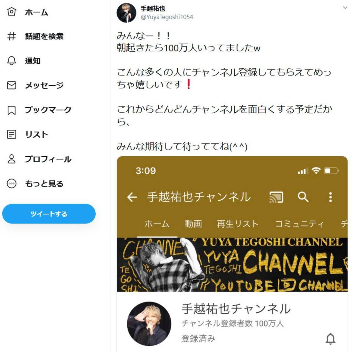 手越祐也さん みんなー 朝起きたら100万人いってましたw Youtubeのチャンネル登録者数が早くも100万人突破 年7月4日 エキサイトニュース